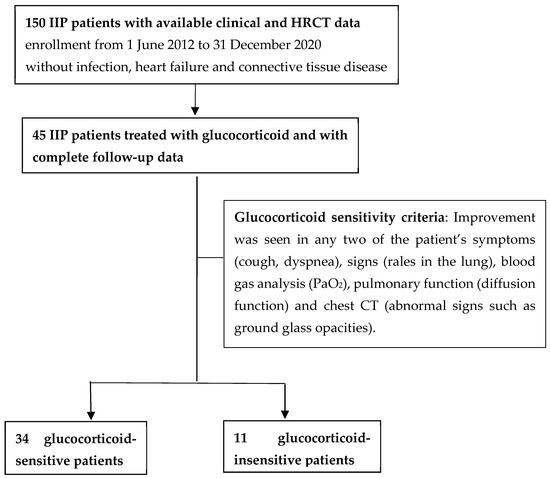 A retrospective case–control study was conducted to collect 150 IIP inpatients treated in the Department of Respiratory and Critical Care Medicine of the Peking University Third Hospital from 1 June 2012 to 31 December 2020. The inclusion criteria included the following: IIP diagnostic criteria as defined by the international multidisciplinary consensus on IIP classification published by the American Thoracic Society (ATS)/European Respiratory Society (ERS) in 2013; a diagnosis of IIP by a clinician, pathologist, or radiologists, including the following pathological types: idiopathic pulmonary fibrosis (IPF), nonspecific interstitial pneumonia, cryptogenic organic pneumonia, acute interstitial pneumonia, respiratory bronchiolitis, interstitial lung disease (ILD), and desquamation interstitial pneumonia; and complete clinical and imaging data. The exclusion criteria were as follows: incomplete clinical or imaging data, and complications of infection, heart failure, or connective tissue disease. The medical records of 150 patients with IIP were reviewed. Forty-five patients were treated with glucocorticoids and had complete follow-up data. According to glucocorticoid efficacy, these 45 patients were divided into a glucocorticoid-sensitive group (34 patients) and a glucocorticoid-insensitive group (11 patients). The glucocorticoid-sensitivity grouping process is presented in Figure 1.The glucocorticoid dosage was 0.5–1 mg/kg/d. The criteria for judging glucocorticoid efficacy were as follows: if an improvement was seen in any two of the patient’s symptoms (cough and dyspnea), signs (rales in the lung), blood gas analysis (PaO2), pulmonary function (diffusion function), and chest CT (abnormal signs such as ground glass opacities), the patient was placed in the glucocorticoid-sensitive group; otherwise, the patient was placed in the glucocorticoid-insensitive group. The criteria for the improvement of each index are as follows: symptoms: the complete absence of cough or a reduction in its intensity and frequency and increased endurance while performing daily activities; signs: reduced or absent; PaO2: increased by ≥4 mmHg; pulmonary function: diffusion capacity of lung for carbon dioxide (DLCO) increased by ≥10%; and chest CT: abnormal signs reduced or absent abnormal signs.