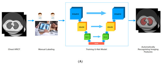 Idiopathic interstitial pneumonia (IIP) is a pulmonary interstitial disease of unknown etiology that is difficult to diagnose and treat. A combination of clinical features, imaging examinations, and pathology are needed to diagnose the disease. The pathology is difficult to obtain. If the patient is not treated in a timely manner, the prognosis is poor. Idiopathic pulmonary fibrosis (IPF) is a common type of IIP that can be diagnosed directly without pathological examination if its typical imaging features are seen in HRCT. However, for IPF with atypical CT manifestations and other non-IPF patients, few treatment methods are available, and only some can be effectively treated with glucocorticoid therapy. If IIP patients sensitive to glucocorticoid therapy can be identified early, it should be started as soon as possible to improve the prognosis. Previous studies [1,2,3,4,5,6,7] have shown that the HRCT imaging characteristics of IIP patients are related to glucocorticoid efficacy. In HRCT, ground glass opacities are mostly related to the active inflammation of the alveoli and alveolar interstitium, which is sensitive to glucocorticoid therapy. In contrast, reticulations and honeycombing are mostly related to alveolar septal fibrosis, which is not sensitive to glucocorticoid therapy, and indicate a poor prognosis. A patient diagnosed with IIP can present with multiple imaging features at the same time, and their area percentages are related to their sensitivity to glucocorticoid therapy: the greater the area percentage of reticulations and honeycombing, the lower the sensitivity to glucocorticoids. The area proportions of imaging features will not be reported in reality. Previous studies have shown that the proportion of different imaging features obtained through manual calculation is related to glucocorticoid sensitivity [2,3]. In recent years, artificial intelligence methods have been widely used in the fields of lung imaging data and diagnosis [8,9,10,11,12,13]. The development of artificial intelligence technology makes it possible to automatically identify imaging features and calculate their proportions. Based on the actual glucocorticoid sensitivity grouping, a hypothesis can be proposed to establish an artificial intelligence model to judge the glucocorticoid sensitivity through HRCT. Due to the low incidence of IIP, no stable artificial intelligence model has been established, particularly one that could assess the correlation between imaging data and glucocorticoid sensitivity. The goal of this study is to establish an HRCT imaging feature recognition model for IIP and a model for preliminarily assessing the correlation between imaging features and glucocorticoid sensitivity with artificial intelligence algorithms.