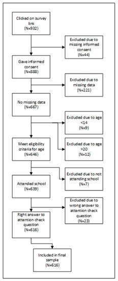 Following the American Association for Public Opinion Research (AAPOR) reporting guidelines for non-probability online samples [42], we report that 71.6% of those who clicked on the survey link completed the entire survey, resulting in a 71.6% participation rate (completion rate). Figure 1 describes the flow of participants. A total of 616 subjects completed the survey that satisfied the inclusion criteria, of whom 477 were girls and 17 identified their gender category as diverse. Since the small sample size of participants describing themselves as diverse turned out to be suboptimal for statistical analysis and would have affected the matching procedure, they were not considered in the further analysis. The descriptive data (unmatched) for the diverse gender category can be found in Supplementary Table S1.