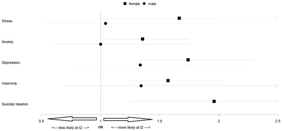 McNemar’s odds ratios (ORs) for clinically relevant symptoms of stress, anxiety, depression, insomnia, and suicidal ideation at t2 versus t1. Stress: PSS-10 score ≥ 14, anxiety: GAD-7 score ≥ 11, depression: PHQ-9 score ≥ 11, insomnia: ISI score ≥ 15, suicidal ideation: PHQ-9 item 9 score ≥ 2. The x-axis represents the odds ratios (ORs): <1—clinically relevant symptoms less likely at t2; >1—clinically symptoms more likely at t2. A 95% confidence interval (CI, indicated as grey lines) overlapping 1 indicates a non-significant difference between t1 and t2. The OR for suicidal ideations among boys could not be calculated due to zero events in necessary cells.