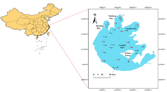 This study investigated the concentrations of eight HMs in surface waters and sediments in Taihu Lake. The lake is located in the lower reaches of the Yangtze River Basin. During the Mesozoic, large-scale granite invaded the basin of Taihu Lake, and the famous Suzhou granite formed. The elevation of the southwestern mountain is higher than the northeast region. The contents of organic matter and carbonate are relatively low in the sediment of Taihu Lake, which has fewer effects on the contents of metal [6]. Taihu Lake is the third largest freshwater lake in China, with a surface area of 2400 square kilometers and a drainage area of 36,895 square kilometers. Taihu Lake is a typical shallow lake with a maximum depth of less than 3.0 m and an average depth of 1.9 m. Taihu Lake has abundant rainfall, with an average annual precipitation of 1100 mL. It belongs to the subtropical monsoon climate zone. The Taihu Lake basin is one of the most developed industrial and agricultural areas in China. It is also an important water source, aquaculture area, and aquatic habitat. Along with the rapid economic development and intensive use of water resources, the water quality of Taihu Lake has deteriorated and suffered from eutrophication and cyanobacterial blooms.