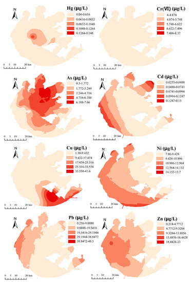 The concentrations of eight HMs are shown in Table 3. The average concentrations of the metals in descending order were Pb (17.69 ± 14.79) > Ni (10.53 ± 2.03) > Zn (6.50 ± 4.85) > Cr(VI) (6.43 ± 1.95) > Cu (5.92 ± 7.41) > As (4.19 ± 1.78) > Hg (0.11 ± 0.04) > Cd (0.07 ± 0.03) µg∙L−1. Generally, the content of HMs in the surface water of Taihu Lake was at a relatively low level. The average contents of Cr(VI), As, Cd, Cu, and Zn in Taihu Lake were lower than the standard values for Grade I surface waters in China (GB3838-2002). The average concentration of Ni was lower than the standard value (20.0 µg∙L−1) for surface water stipulated in China. The average concentration of Pb in the surface water of Taihu Lake was lower than the standard value for Grade III surface waters in China (GB3838-2002), and the average concentration of Hg was lower than the standard value for Grade IV surface waters in China (GB3838-2002). As shown in Figure 2, the spatial distributions of As, Cd, Ni, Pb, and Zn in the surface water of Taihu Lake generally showed a decreasing trend from north to south and from west to east. High concentrations of As, Ni, Pb, Cd, and Zn were found in the northwest part of the Taihu Lake Basin. The high value of Cu concentration was located in the southeastern region of the Taihu Lake Basin. Regarding Hg (sampling sites 18 and 24) and Cr(VI) (sampling sites 2 and 11), only two points were detected.