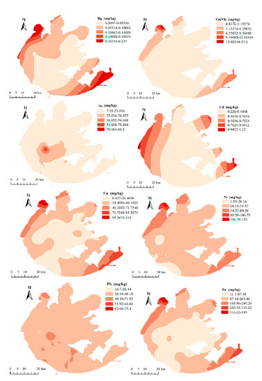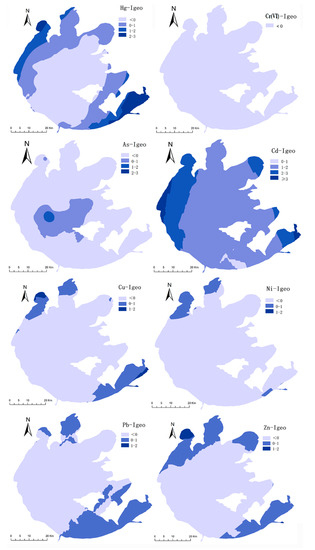 Spatial distributions of the geo-accumulation index (Igeo) of heavy metals in sediments.