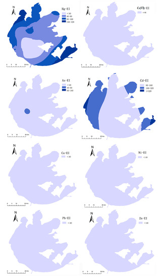 Spatial distributions of EI index for individual heavy metals in sediments.