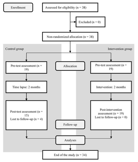 A total of 19 healthcare professionals applied to participate and attended the first session; all of them completed the training course and the pre- and post-test. Regarding the control group, 19 healthcare professionals consented to being part of the study, but only 15 completed the pre- and post-test. Of the 19 subjects who completed the course, 17 attended six to eight sessions and two missed four sessions. A flow diagram showing the participants’ progression through the study is shown in Figure 1.