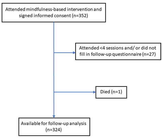 Of all included participants (n = 352), 343 (97.4%) attended four or more of the seven group sessions. A median of 6 out of 7 group sessions (interquartile range [IQR], 6–7) were attended. The number of participants taking part in the 6-month follow-up assessment was 327 (92.9%). Overall, 324/352 participants (92.0%) completed the baseline and 6-month follow-up questionnaires, attended ≥4 sessions, and were included as the study sample for further analyses. Baseline characteristics of the 28 dropout participants were not significantly different from the included participants, except for the study site. The participant flow chart is shown in Figure 1.