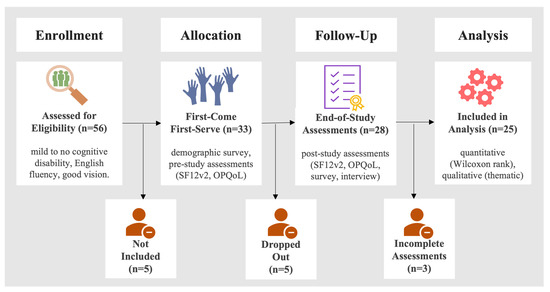 To recruit participants for the study, we conducted two meetings at the approved study locations. During the meetings, we invited the residents to participate in the study by explaining the study purpose and inclusion criteria (described below). At the conclusion of the meeting, interested residents voluntarily signed up to participate in the study. The interested residents were then invited to a follow-up meeting, where they were first informed of their rights as study participants and privacy information regarding the collected data. The residents who agreed with these procedures signed a consent form. Following this, participants were screened and enrolled if they met the following inclusion criteria: mild to no cognitive disability (determined by the Saint Louis University Mental Status Exam (SLUMSE) [35]), fluency in English, and good vision. SLUMSE was used as the screening tool because it was been used by the AiP to screen participants for dementia. Participants were excluded if they were planning to move out of the independent living facilities, uninterested in study activities, or if they had cognitive impairments. Participants who passed the screening and met the eligibility criteria completed a demographic information form. They were, then, asked to complete the pre-study assessments described in Section 2.5.