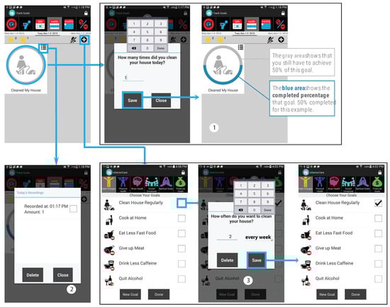 Features of eSeniorCare’s goal component. (1) Goal tracking process, (2) Viewing tracking history, and (3) Goal setting process.