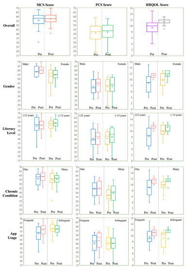 The Short Form version 2 (SF12v2) health survey [49] is a 12-item validated questionnaire targeting eight functional domains: bodily pain, physical function, role physical, role emotional, mental health, vitality, social function, and general health. These domains are further classified as a physical component summary (PCS) and mental component summary (MCS), which correspond to self-assessments of physical and mental health, respectively. In essence, PCS is a combination of SF12v2 categories that primarily evaluate an individual’s general health, bodily pain, physical function, role physical, etc. On the other hand, MCS is a combination of SF12v2 domains that focus on individuals’ perceptions of depression, anxiety, and social activity. We administered this instrument both at the beginning and at the end of the study to assess participants’ perceptions of their health. We chose SF12v2 because, compared to SF36v2, it is both a concise (hence, reducing patient burden) and comprehensive patient-reported outcome measurement [50]. It has also demonstrated efficacy across age, disease and treatment groups [51,52]. In contrast, other surveys are either disease-specific (e.g., QLQ-C30 [53]), or domain-specific (e.g., Duke-UNC Functional Social Support [54]), which restricts their usage in the general population.