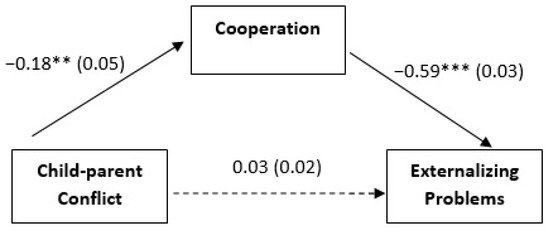 Cooperation as mediator of the association between Child–parent Conflict and Externalizing Problems. Unstandardized coefficients are reported with standard errors in parentheses. The model includes Gender as a covariate of both Cooperation and Externalizing Symptoms. Analyses were based on 5000 bootstrap samples with 95% bias-corrected confidence intervals; ** p < 0.01; *** p < 0.001.