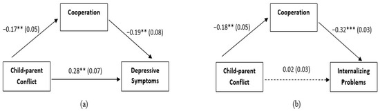 Cooperation as mediator of the association between Child–parent Conflict and Depressive Symptoms (a) and Internalizing Problems (b). Unstandardized coefficients are reported with standard errors in parentheses. Both models include Gender as a covariate of Cooperation. Analyses were based on 5000 bootstrap samples with 95% bias-corrected confidence intervals; ** p < 0.01; *** p < 0.001.
