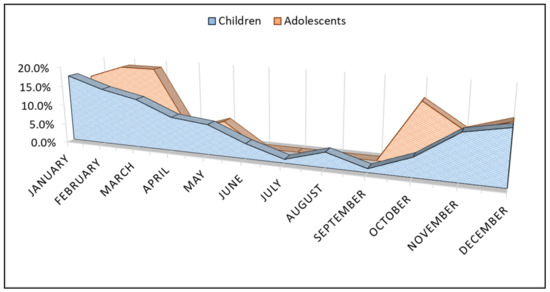 Comparison of measles cases proportions by month of infection with stratification by group of children and adolescents.