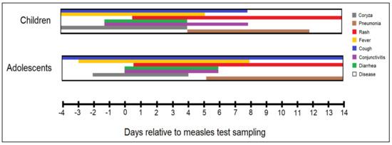 Timeline of measles signs and symptoms occurrence and duration, stratified between children and adolescents relative to measles IgM test sampling. Day 0 is considered the date of IgM antibody testing.