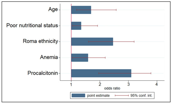 The multivariate risk factor analysis presented in Figure 3 included a total of 126 unvaccinated children and identified as independent risk factors the age of patients (OR = 1.62), poor nutritional status (OR = 1.25), Roma ethnicity (OR = 2.44), anemia (OR = 1.58), and elevated procalcitonin (OR = 3.09) as statistically significant independent risk factors for the development of pneumonia in pediatric patients with measles.