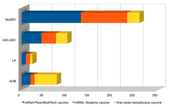 Histogram of COVID-19 vaccine types and corresponding adverse effects. Legend and abbreviations: y = vaccinated women with menstrual irregularities due to other causes, NoADV/vaccinated women whose menstrual irregularities could be adverse effects to vaccine, VAX-ADV/which adverse effect, late period, LP, or abnormal uterine bleeding, AUB; x = number of all vaccinated women with menstrual irregularities.