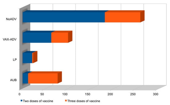 Histogram of COVID-19 vaccines doses and corresponding adverse effects. Legend and abbreviations: y = vaccinated women with menstrual irregularities due to other causes, NoADV/vaccinated women whose menstrual irregularities could be adverse effects to vaccine, VAX-ADV/which adverse effect, late period, LP, or abnormal uterine bleeding, AUB; x = number of all vaccinated women with menstrual irregularities.