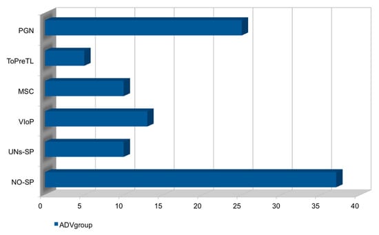 Adverse effects-group (ADV) characteristics and variables (expressed in percentage, %). Abbreviations: VAX, vaccine; LP, late period; AUB, abnormal uterine bleeding group; dd, days; avg, average.