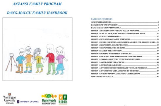 - Asampong, E.; Ibrahim, A.; Sensoy-Bahar, O.; Kumbelim, K.; Yaro, P.B.; McKay, M.M.; Ssewamala, F.M. Adaptation and Implementation of the Multiple-Family Group Intervention in Ghana. Psychiatr. Serv. 2021, 72, 571–577. [Google Scholar] [CrossRef] [PubMed]