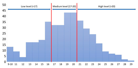 The mean value of the DDGA Index was 18.68 (SD = 3.97) in the study group with the minimum of 9 points and maximum of 29 points. A low level of adherence to recommendations (stens 1–4) was obtained by 28.9% of the respondents (n = 114), a medium level (stens 5–6) by 37.8% of the respondents (n = 149), and a high level (stens 7–10) by 33.3% of the respondents (n = 131). The characteristics of the DDGA Index scores obtained in the study group were presented in Figure 1.