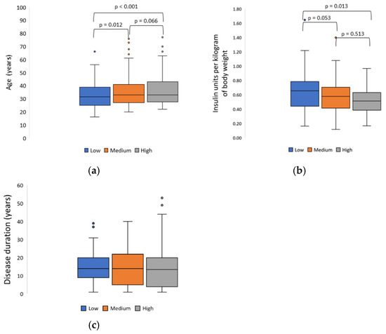 (a) Mean age (F = 8.755, p < 0.001), (b) mean insulin dose per kilogram of body weight (F = 3.364, p = 0.036), (c) mean disease duration (F = 0.004, p = 0.996) depending on the level of adherence to dietary recommendations (the p-values for the Fisher’s Least Significant Difference post hoc test are reported).