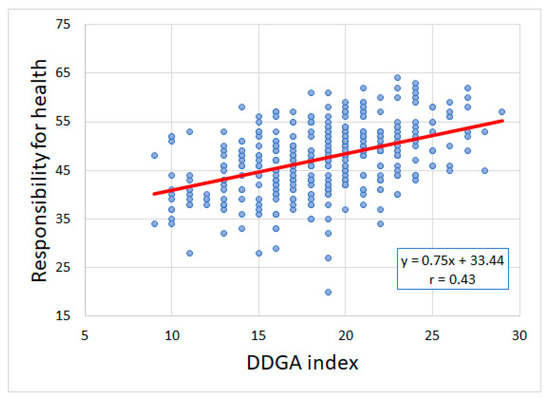 The assessment of the multifactorial influence of independent variables on the DDGA Index, including the “responsibility for health” variable was performed with the use of a linear regression model. The estimation of model parameters was calculated with the method of least squares. We determined standardized regression coefficients (βstd.) with 95% confidence intervals (CI) in order to estimate the directions and strength of correlations between variables. Adjusted R2 value was determined to assess the degree of variance by the assessed regression model.