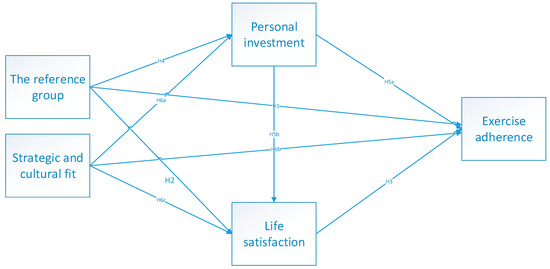 Stimulus-Organism-Response (SOR) framework suggests that stimuli elements affect individuals’ psychology, evaluation, and cognition towards things, which then influence individuals’ responses [38]. For instance, Jang, Byon, and Yim [39] found that sportscape has an impact on individuals’ emotions as spectators, which then affects their behavior intention. Emotion is found to exert mediating effects between sportscape and behavior intention, based on a SOR framework. The reference group and strategic and cultural fit contain the most external stimuli for residents, which all have an impact on residents, and which would change residents’ attitude towards exercise as well as the investment in exercise. Furthermore, as residents invest more in exercise, under the influence of the reference group and strategic and cultural fit, residents’ psychological fulfillment and life satisfaction will be higher, at which point residents are more likely to exhibit adherence to exercise. Therefore, in SOR theory, the reference group and strategic and cultural fit are the stimuli that have an impact on residents’ psychology, cognition and evaluation, personal investment; life satisfaction could be seen as an organism in SOR theory; exercise adherence is the residents’ response to the stimuli. In accordance with this, under the influence of the reference group and strategic and cultural fit, residents’ personal investment and evaluation of life have changed, and the response will also be different. Therefore, personal investment and life satisfaction play a chain mediating role between the reference group and exercise adherence, strategic and cultural fit, and exercise adherence. Accordingly, the following hypotheses are proposed: