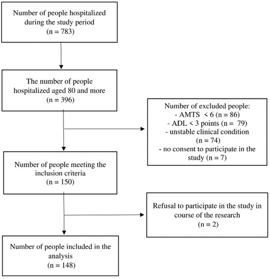 In the course of the study, 783 people were hospitalized in the ward, including 396 aged 80 and more. After taking into account the exclusion criteria concerning health and functional status of the subjects, 246 people were excluded from further study. In addition, of those who met the inclusion criteria, 2 people left the study after it had started. After considering all inclusion and exclusion criteria, 148 patients were included in the final analysis (Figure 1).