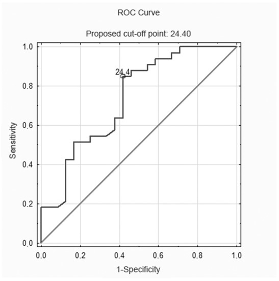 Due to the fact that the logistic regression model showed a significant statistical influence in only one of the analyzed functional tests (handgrip strength) on the occurrence of anaemia in the group of males, to determine the value of handgrip strength, from which anaemia could be predicted in this group, the ROC curve was determined. The area under the curve (AUC) was higher than 70%, which means that the value of handgrip strength can be considered as a parameter that differentiates the incidence of anaemia in males over 80 years of age. It was shown that the cut-off point for anaemia in the study group was 24.4 kg, with a sensitivity of approximately 85% (Figure 2).