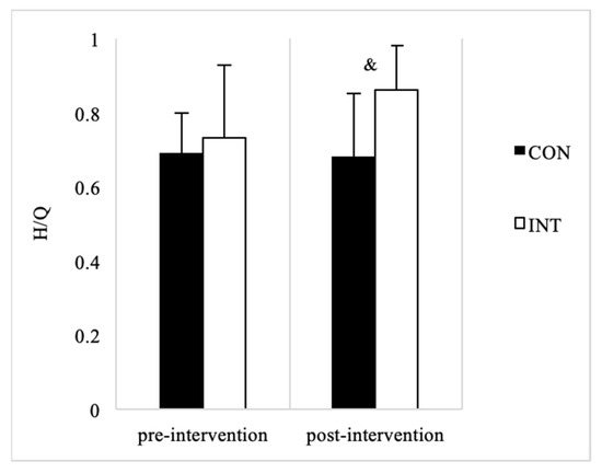 After eight weeks of FIFA 11+ there was a significant difference in knee flexor strength in INT players, with greater strength observed post-intervention (p < 0.05). The change in the CON players was not significantly different from pre- to post-tests. Knee extensor strength of the INT players was slightly reduced after FIFA 11+ (p < 0.05), but did not change significantly for the CON players (Table 2). As a result, the H/Q of maximum strength was significantly higher in post-testing for the INT players compared to CON players (p < 0.05) (Figure 1).
