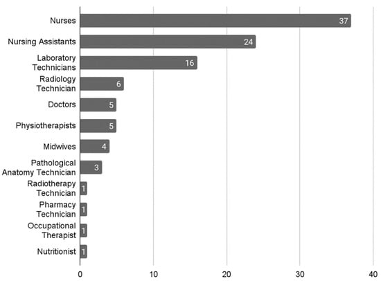 The questionnaire was sent to 1000 students and the response rate was approximately 10%. Two reminders were sent during the time the questionnaire was open in order to increase the number of responses. Finally, 104 responses were received from people who had taken courses in one of the two collaborating companies. Of these, 37 responses were received from nurses, representing the majority group, followed by the group of nursing assistants with 24 responses, and then laboratory technicians with 16 responses; other occupational profiles are detailed in Figure 2.