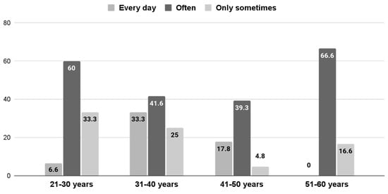 If a comparison is made between different age groups, we can see that the 51–60-years-old group is the one who most uses what they learned in the course “often” at 66.66%, followed by the 21–30 age group at 60%, the 31–40 age group at 41.66%, and the 41–50 age group at 39.28%. However, if we compare different age groups as for those who apply it every day, we can conclude that it is the 31–40 age group at 33.33% who put it into practice most on a daily basis, while from the 21–30 group, only 6.66% apply it every day, and the group of 51–60 years old never use it daily. A proportion of 42.85% of the participants aged 41–50 apply what they have learned only at times. These comparisons can be observed in detail in Figure 3 (p = 0.4061).