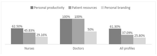 As for nurses, 62.5% admitted using what they learned in their training to improve their personal productivity, 45.83% specifically to elaborate resources for patients, 29.16% to build their personal brand and communication on social media, and 25% for research purposes. All doctors claimed to use what they learned to make resources for patients and improve their productivity; none used it for research purposes, and only two used it to enhance their brand and communicate on social networks. Figure 4 shows the comparison of the percentage of use of what was learned among doctors, nurses, and all other profiles.