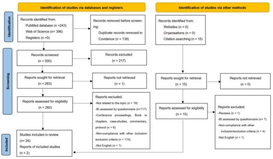 A total of 639 articles were identified through the search conducted on the databases. Following the article selection procedure (Figure 1), 28 studies were included in the systematic review. After removing 139 duplicates, 500 articles were screened against title and abstract for eligibility for inclusion criteria. Studies excluded after the title and abstract screening were 217. Therefore, 283 studies were assessed for full-text eligibility; however, one study could not be retrieved. Thus, 282 studies were the number of articles assessed for full-text eligibility. Of these, 257 were excluded for several reasons: BI assessed by questionnaire (n = 117); conference proceedings, book or book chapters, case studies, commentary, protocol (n = 6); not written in English language (n = 1); non-compliance with other inclusion/exclusion criteria (n = 114); not related to the topic (n = 19). Therefore, 26 articles met the inclusion criteria. Two additional articles were included in the review from citation searching, so the articles included in the review were 28.