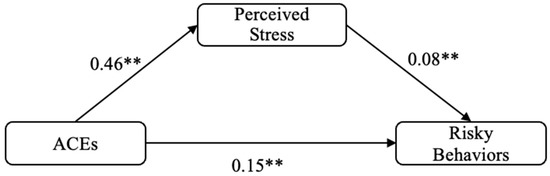 Mediation analysis model linking ACEs to risky behaviors through perceived stress. ** p < 0.01.