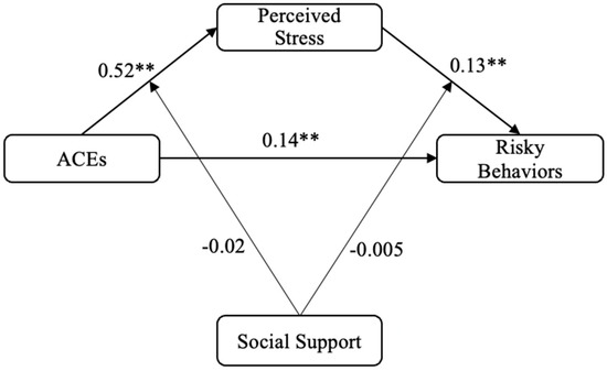 Table 2 shows the correlations between total ACEs score, perceived stress, perceived social support, and total risky behaviors. Results indicated that all these variables were significantly correlated with each other. The largest coefficient observed was the correlation between perceived stress and perceived social support (r = −0.35).