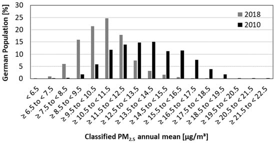 The overall trend of decreasing PM2.5 exposure in Germany was also reflected in the results of the population-weighted PM2.5 annual mean indicator (Figure 2). In 2010, the value was 13.7 µg/m3; in 2018 it was considerably lower with 10.8 µg/m3, representing a reduction of approximately 21% compared to 2010. However, this trend seems to level off within the last three years of our study.