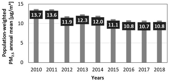 Nationwide population-weighted PM2.5 annual mean exposure from 2010 to 2018 in Germany.