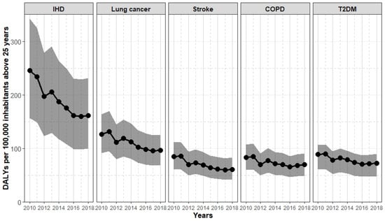 Burden of disease (DALYs per 100,000 people above 25 years including 95% UI) from 2010 to 2018.
