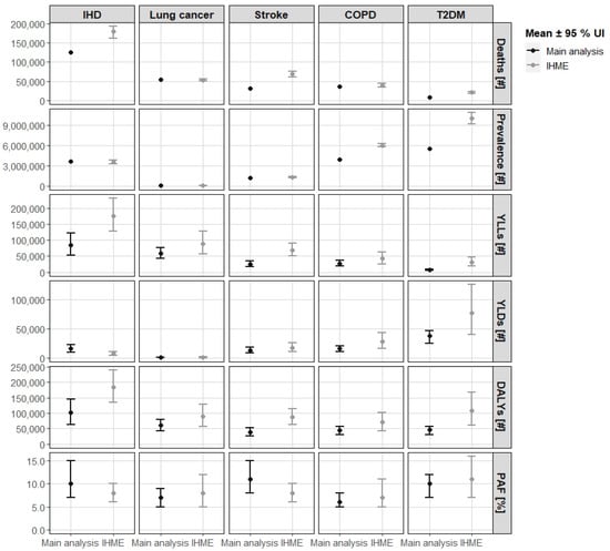 Comparison of the main analysis with IHME’s GBD-2019 study estimates for the year 2018. PAF = population attributable fraction. YLLs = years of life lost due to mortality. YLDs = years lived with disability. DALYs = disability-adjusted life years. UI = uncertainty interval. COPD = chronic obstructive lung disease. GBD = global burden of disease. IHD = ischemic heart disease. IHME = Institute for Health Metrics and Evaluation. T2DM = type 2 diabetes mellitus.