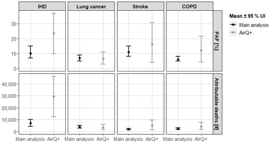 For both, PAF and attributable death estimates, the majority of the AirQ+ results were considerably higher than the corresponding results of our main analysis (Figure 5). For example, attributable death estimates were about four times higher for IHD (29,673; 95% UI 12,375–46,342) and about 2.7 times higher for stroke (5082; 95% UI 1268–9625) than the respective results of the main analysis (IHD: 6977; 95% UI 4285–10,069; stroke: 1871; 95% UI 1314–2582). For lung cancer, the results were rather similar with 3445 (95% UI 1558–5900) attributable deaths for AirQ+ as compared to 3785 (95% UI 2699–4939) for our main analysis.