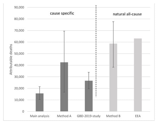 One aim of this study was to compare the burden of disease estimates derived by different institutions. Attributable deaths were chosen as the common measure for comparisons, as all institutions provided such estimates. However, the results of the different quantification methods investigated in this study were quite different. In method B and in the EEA estimates, natural all-cause mortality data (ICD-10-codes from A00 to R99) were used, which lead to overall higher estimates of attributable deaths (Figure 6). Therefore, these calculations also included causes of deaths that may not be related to air pollution, which seems to be a likely reason for an overestimation. However, the fact that the investigated health outcomes in this study represent only a selection of attributable health outcomes with the strongest scientific evidence, and recently other studies indicated an increasing number of outcomes being associated with air pollution [10], might decrease this overestimation effect to a certain extent.