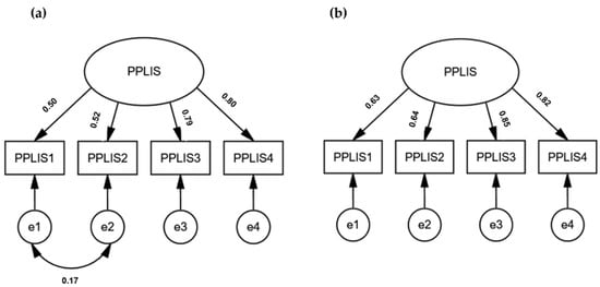 The CFA was conducted for Sample 2 of Polish emerging adults (university students under 26, N = 448) and Sample 3 (Polish and Ukrainian adults aged above 25 years old, N = 652) separately. As shown in Figure 1a, the loading weight ranged between 0.50 and 0.80. The fit indices were excellent for Sample 2, χ2(1) = 2.13, p = 0.144, SRMR = 0.010, CFI = 0.997, RMSEA = 0.050 (90%CI = 0.000, 0.147). Considering the confirmatory composite analysis (CCA), Cronbach’s α = 0.76, CR = 0.754, and AVE = 0.445, suggesting that the structure is acceptable []. The CFA loadings for Sample 3 ranged between 0.63 and 0.85, as presented in Figure 1b. The fit indices were excellent for Sample 3, χ2(2) = 0.83, p = 0.661, SRMR = 0.005, CFI = 1.000, RMSEA = 0.000 (90%CI = 0.000, 0.060). The CCA was also adequate for Sample 3, including Cronbach’s α = 0.82, CR = 0.828, and AVE = 0.55. Configural multigroup measurement invariance was examined across genders and countries. The baseline model was compared to the unconstrained model for genders in Sample 2. The unconstrained model showed a good fit, χ2(2) = 1.966, p = 0.374, SRMR = 0.016, CFI = 0.100, RMSEA = 0.000 (90%CI = 0.000, 0.093), showing that the structure of PPLIS is invariant across genders. The configural MI was examined in Sample 3. The results repeated previous findings, demonstrating that the one-factor structure is invariant across gender, χ2(4) = 2.509, p = 0.643, SRMR = 0.006, CFI = 0.100, RMSEA = 0.000 (90%CI = 0.000, 0.048). Similarly, Polish and Ukrainian university students do not differ in factor structure, χ2(4) = 3.498, p = 0.478, SRMR = 0.015, CFI = 0.100, RMSEA = 0.000 (90%CI = 0.000, 0.056).