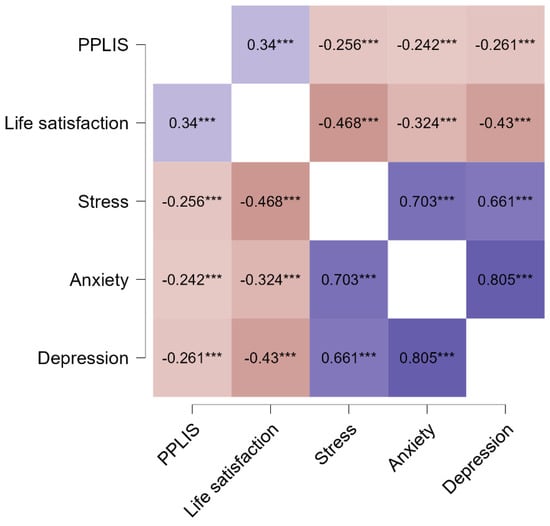 Pearson’s correlations between the perceived positive lockdown impact scale (PPLIS) and well-being dimensions: life satisfaction, perceived stress, anxiety, and depression. N = 3230, *** p < 0.001. Violet represents a positive correlation and red a negative correlation.