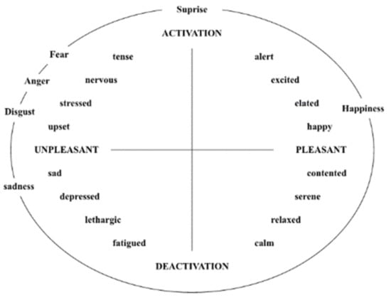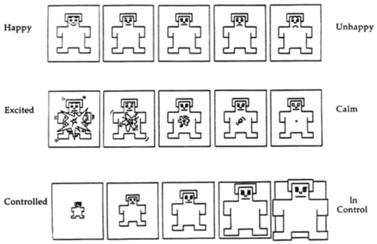As depicted in Figure 1, the Self-Assessment Manikin (SAM) is a nonverbal graphical assessment approach that directly evaluates pleasantness, arousal, and dominance in connection to a person’s emotional response to diverse stimuli []. Each dimension represents an object, and the degrees of emotional state are represented by five manikins. The assessor compares his or her own emotional state to that of the manikin, selecting the suitable model or a state between the two models and scoring it on a scale of 1–9. The first row from left to right indicates a drop in pleasure (being less joyful), the second row from left to right indicates a decrease in arousal (getting less enthusiastic), and the third row from left to right indicates an increase in dominance (becoming assertive). Pleasure and arousal indicated by SAM have been shown to be strongly correlated with physiological and behavioural responses. Lang [] examined how valence and arousal may be used to categorize emotions in a two-dimensional space. Valence, according to his hypothesis, spans from unpleasant (negative) to pleasant (positive), while arousal, which reflects how intensely persons feel, ranges from passive (low) to active (high). Because different emotions can be plotted in these two dimensions, as shown in Figure 2, the study used the first two SAM measures as emotion scales to record individuals’ emotional states.