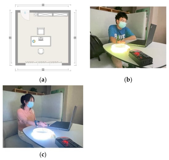 The setting and LED light installation. (a) The experiment was carried out in an enclosed space of 25 m2, with only a desk and a light at a distance of approximately 800 mm from the participants’ eyes. (b) Participant immersed in the warm light environment. (c) Participant immersed in the cold light environment.