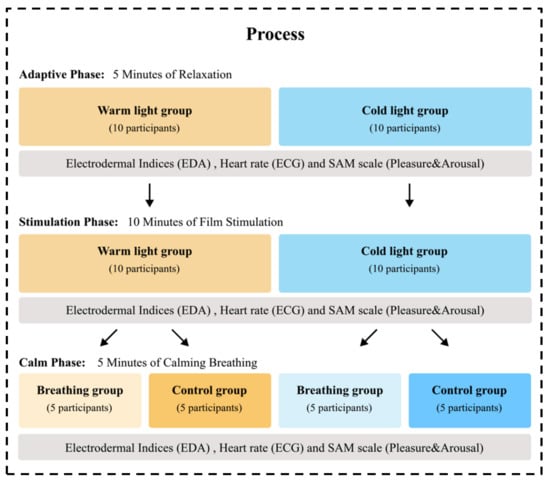 This study proposes that adding the breathing mechanism to a light environment can interact with users, which may make a positive influence on mood regulation. To better control the variables, this research was conducted in the evening, focusing on the artificial light environment. Mood changes are usually accompanied by changes in physiological parameters such as skin conductance and heart rate [,]. This study investigated the effects of light temperature and light breathing processes on self-perception (valence and arousal) and physiological indicators (ECG, pulse, and EDA), as a preliminary attempt at innovative use of light.