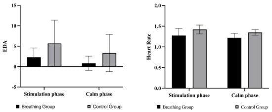 EDA values and Heart Rate for the respiratory and control groups during the stimulation and pacification phases.