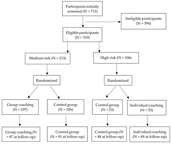 A total of 713 participants were screened for eligibility (Figure 1). Of these, 319 participants were randomized into four arms: group lifestyle coaching (N = 107), individual lifestyle coaching (N = 53), the control group for group lifestyle coaching (N = 106), and the control group for individual lifestyle coaching (N = 53). Information on at least one of the outcomes was available for 97 in group lifestyle coaching, 49 in individual lifestyle coaching, 91 participants in the control group for group lifestyle coaching, and 48 in the control group for individual lifestyle coaching. A total of 115 participants had missing data on at least one of the secondary outcomes of the study. In total, 34 participants had missing data on depressive and anxiety symptoms, 41 participants had missing data on work ability, and 88 had missing data on sleep duration and daily stress at the follow-up. The distribution of age, gender, education, body mass index, work ability, depression, and anxiety at baseline did not differ between participants with missing data for one or more outcomes at follow-up and those without missing data.