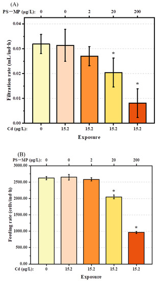 While the single dose of Cd (15.2 μg/L) showed no significant effects (p > 0.05), cotreatment had adverse effects on T. japonicus in a concentration-dependent manner, including decreased filtration and feeding rates, and oxygen consumption, as well as delayed growth and reproductive failure. Similar results were reported previously for polyethylene (PE) and polyamide-nylon 6 (PA 6) microplastics, which also negatively influenced the feeding of T. japonicas in a dose-dependent manner [26]. Similarly, a recent study reported that the heart rate of zebrafish embryos was significantly decreased when exposed to PS-microplastic, alone or admixed with Cd, in a PS-microplastic dose-dependent manner [27].