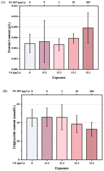 The nutritional components of each treatment are shown in Figure 6A–C. Compared with the control group, Cd treatment was associated with a slight increase in the TG content of the copepods. However, the TG content decreased with successive increases in PS-microplastic concentration, with a 27.0% decrease seen in the Cd + 200 μg/L PS-microplastic cotreatment group compared to the corresponding control. The GLU content also showed a dose–effect relationship, with a significant decrease of 32.5% seen in the Cd + 200 μg/L PS-microplastic cotreatment group compared to the corresponding control. (p < 0.01). There were no reductions in nutritional components but a slight increase in GLU content on cotreatment with 2 μg/L PS-microplastic compared to exposure to Cd alone, indicating that a low concentration of PS-microplastic did not significantly affect the nutritional components of the copepod.